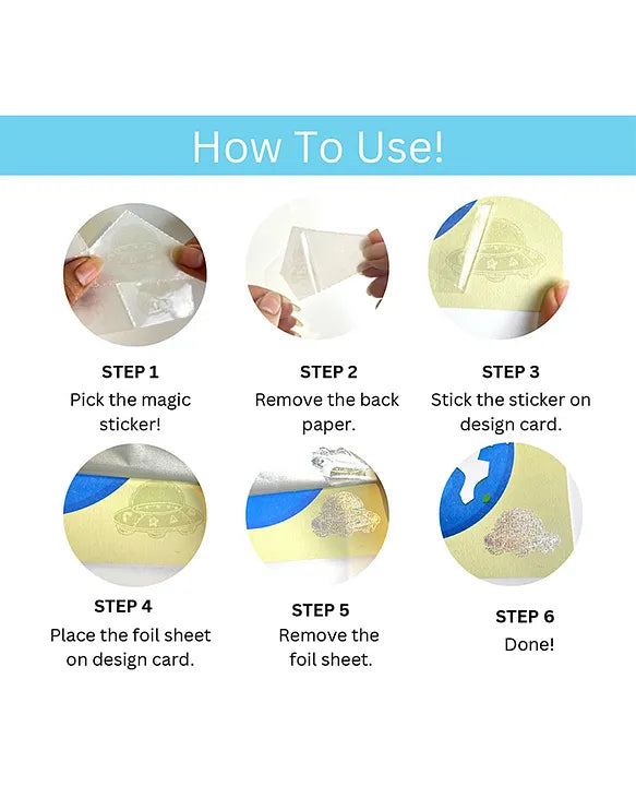 How to Use - Take the design card of your choice and paste the sticker of your choice on the design card with the help of the stylus. Make sure you properly paste the sticker/s and cut the extra ends. Now put the foil of your choice on the sticker. Put the colored end on the sticker and not from the opposite side. Slowly press & dab the foil on the sticker and remove it with a little pressure. You're done! See 'magic' on your card. Transfers are permanent, crisp, and detailed.
