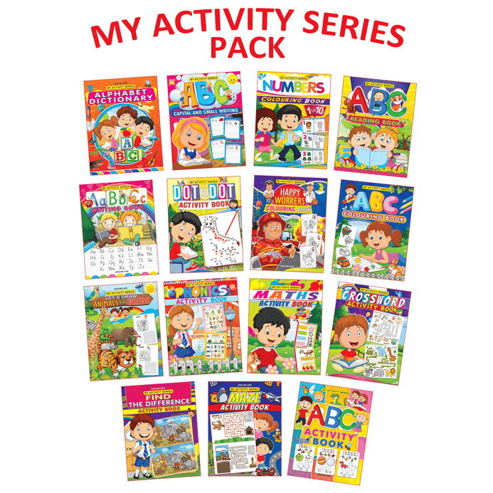 ‘My Activity Books’ is a collection of fifteen fun and educational activity books. These activity books include Alphabet Dictionary, ABC Capital and Small Writing, Numbers, ABC Reading, ABC Writing, Dot to Dot, Happy Workers, ABC Colouring, Let’s Animals in Grids, Phonics, Maths, Crossword, Find the Difference, Maze, and ABC Activity. This collection of activities will help children build their confidence and push them to work on more. • Ideal for ages 3-7 • Colourful presentation • Fifteen books of 32 pages • Different themed entertaining and engaging activities • Cute cover design These books are both fun and educational. The activities will inspire kids to learn basic concepts of early education. It is indeed a head start to help early learners enhance their reading, colouring, mental focus, hand-eye coordination, and more.