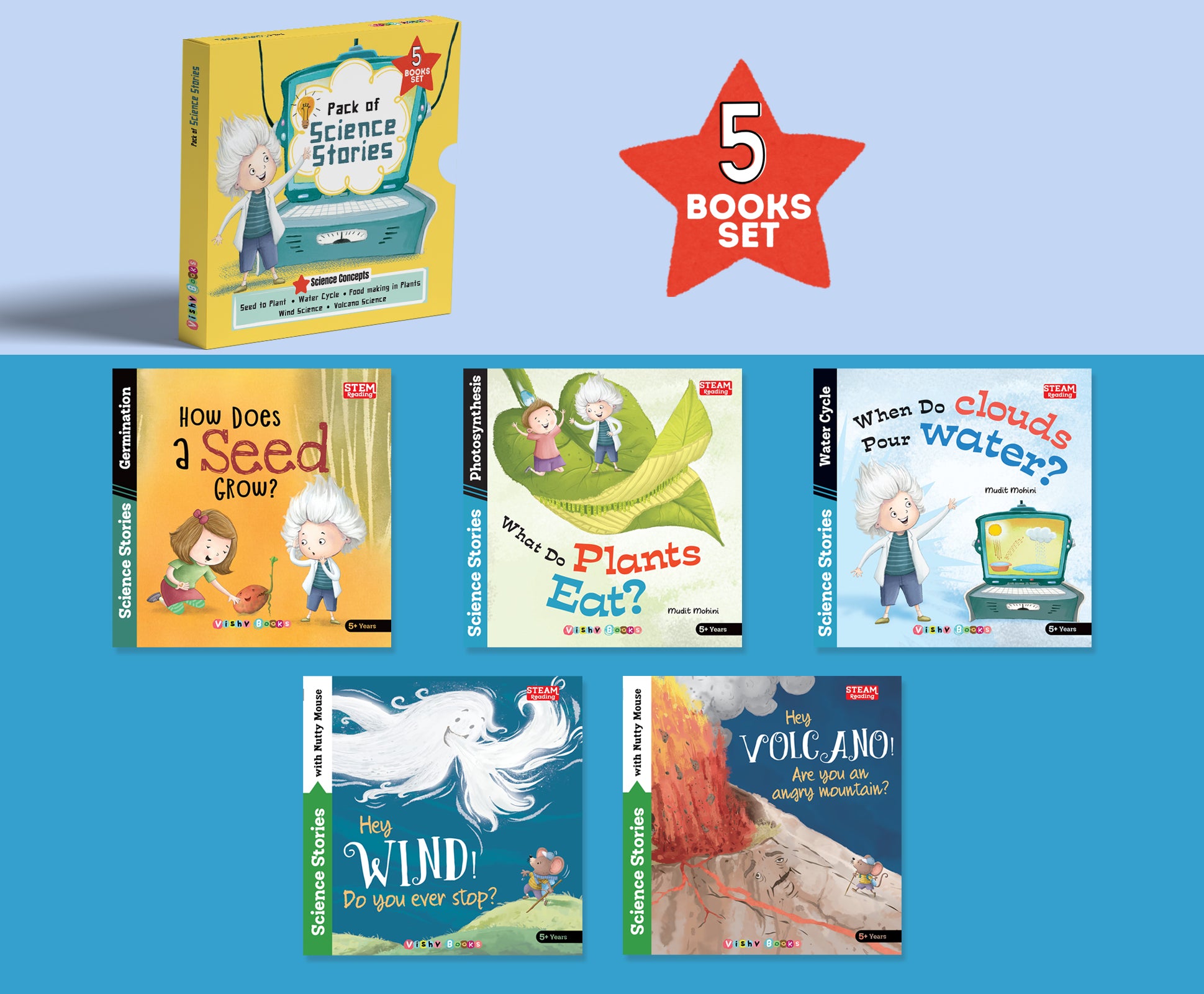 Make science exciting for your child with this engaging box set of five science storybooks! Designed to develop curiosity and interest in science, each book integrates key concepts into fun, relatable stories without using complex terminology. Covering essential topics like the seed-to-plant journey, the water cycle, food-making in plants, wind science, and volcanoes, these books explain scientific principles in an easy-to-understand and enjoyable manner. Whether for home or classroom learning, this box set is an excellent resource for little learners beginning their STEAM journey!
