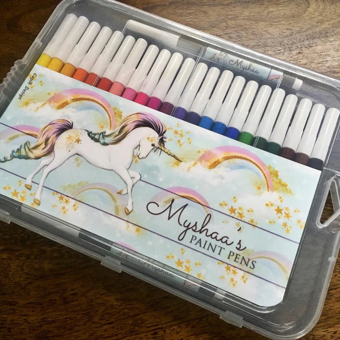 Let that creativity burst forth with our box of 24 vibrant aqua sketch pens. Available in a gorgeous, large, personalised transparent box. Each sketch pen is personalised so they’re less likely to get lost in the classroom! Pick one for yourself or as a perfect gift for any art-loving child or grown-up!