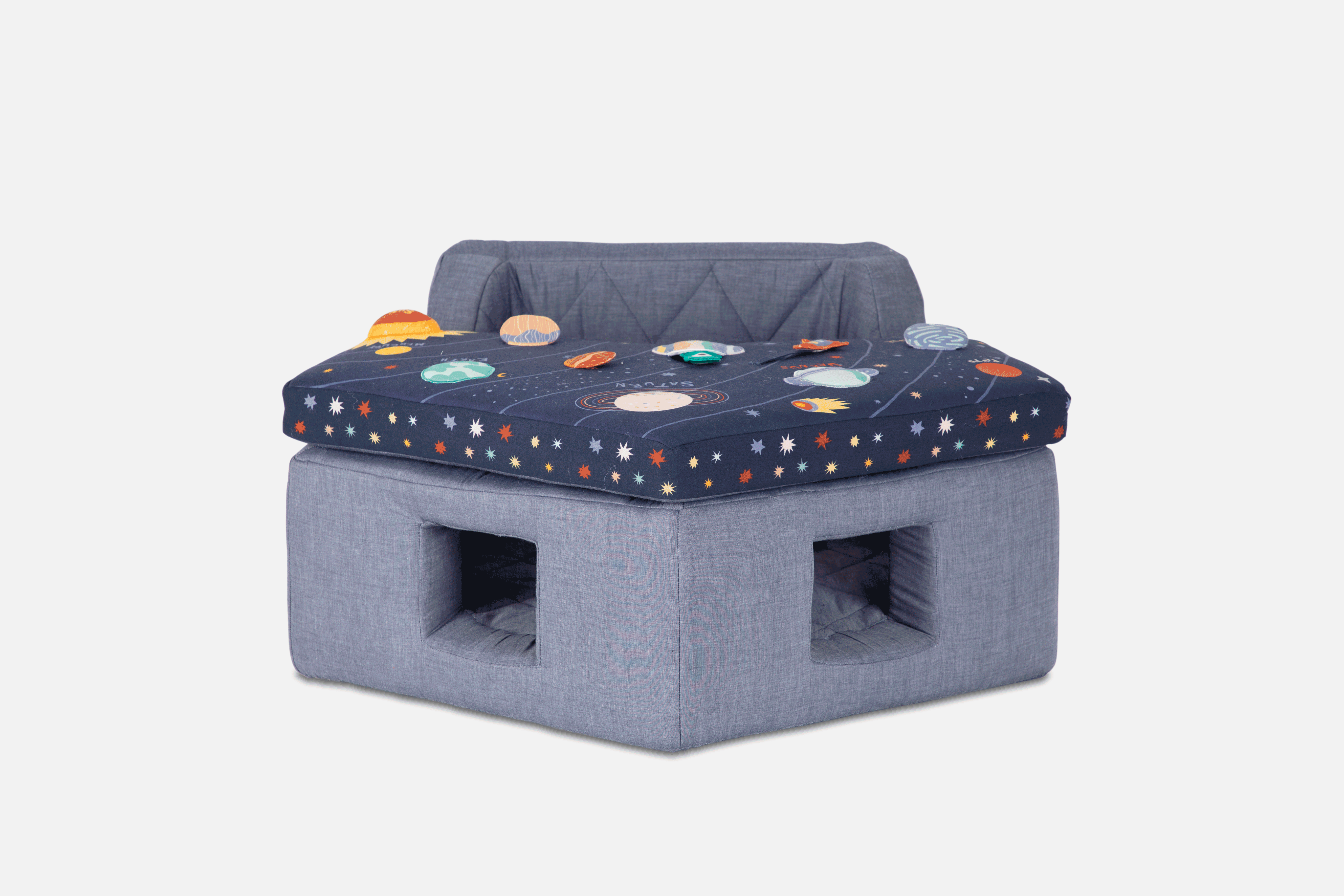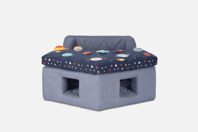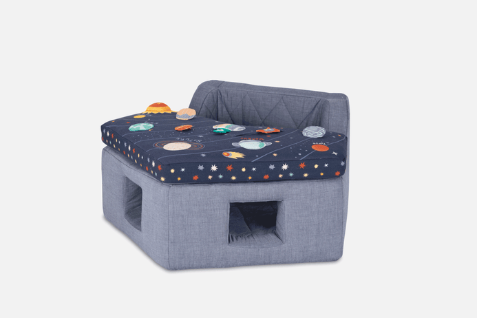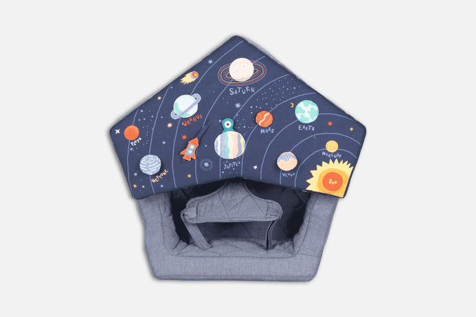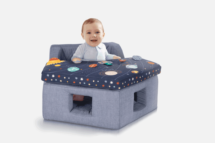 This Baby Activity Center- Space in your orbit, playtime is always ready for liftoff. The chairs removable tray has plenty to keep curious cadets active and stimulated, from a mirror and rattle to squeakers. A cotton seat makes for comfy voyages through the imaginary cosmos, Activity chair should only be used on the floor and never placed on a table, chair or any other surface. Use only under adult supervision and never leave child in chair unattended. Use only with waist harness and tray secured into place. Handmade and embroidered. Features removable tray with squeaker, crinkle material, mirror and rattle to help stimulate baby’s senses. Harness to hold baby in place.