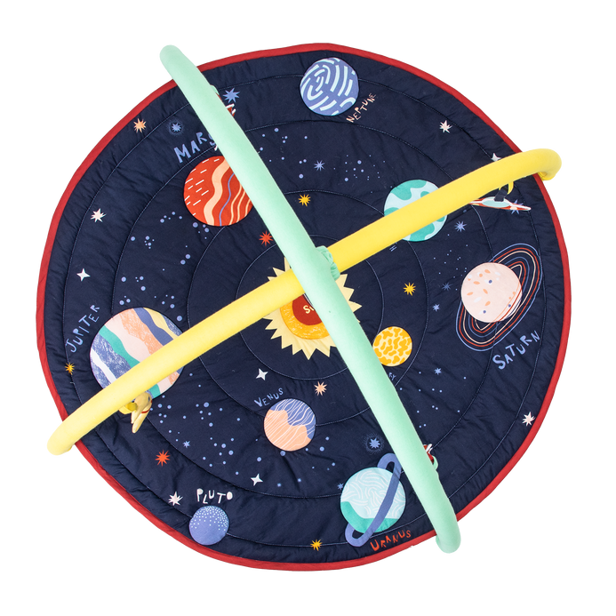 Reach for the Stars with Our Under the Stars Baby Activity Gym !Transform your little one into a budding astronaut with our Under the Stars Baby Activity Gym, where "reaching for the stars" takes on a whole new dimension of excitement. This stellar play space includes five space-themed detachable hanging rattles, ensuring your astronaut-in-training stays active and endlessly stimulated during playtime. The comfort journey begins on the comfiest activity gym in the Milky Way, featuring a soft cotton mat adorned with a dazzling planet pattern. The mat's surface, crafted from high thread count pure cotton percale, ensures a luxurious feel, while the back, made of cotton canvas, adds durability to this celestial adventure. Generously padded with antimicrobial and hypoallergenic polyester wadding, it provides a safe and hygienic space for your little one's exploration. Measuring 36" W x 28.5" H, our Starry Night Baby Activity Gym comes with essential safety reminders. Adult supervision is required, and never leave your child unattended. Avoid allowing children to sleep on the product, and be cautious of potential strangulation hazards. Place the gym only on the floor, avoiding elevated surfaces. The set includes five rattles and is machine washable, making maintenance a breeze. Suitable for newborns, this stellar creation is proudly made in India, offering a celestial sanctuary for your baby's early developmental adventures. Invest in quality, safety, and cosmic comfort with our Under the Stars Baby Activity Gym.