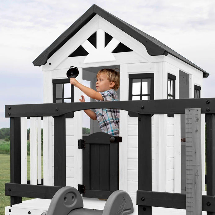 Raise the bar on backyard fun with the Sweetwater Heights Playhouse by Backyard Discovery. This elevated outdoor playhouse combines stylish charm with exciting play features, while being perfectly sized for any outdoor space. Kids will love exploring their very own clubhouse, complete with a wrap-around deck, wide step ladder, and wave slide. Inside this charming wooden playhouse, an interactive play kitchen inspires creativity with its toy stovetop, battery-powered appliances, built-in sink, and other accessories. The adorable working door and large windows allow plenty of natural sunlight and fresh air while making it easy to supervise playtime activities. Children of various ages can safely access their elevated retreat using the sturdy entry ladder with wide-rung steps. Make lasting memories by tracking your little ones' growth with the attached measurement board. The versatile space beneath this backyard playset offers endless possibilities – create a fun sandbox area or use it for convenient toy storage. Crafted from naturally strong cedar wood and finished with sophisticated neutral colors, it provides striking beauty and long-lasting durability for many years of outdoor adventures. The Sweetwater Heights combines a traditional kids playhouse with elevated fun, creating the perfect space for endless childhood memories and active outdoor play.