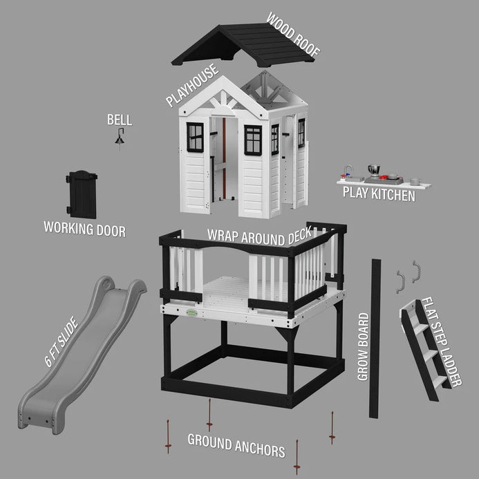 - Elevated Adventure: Raised clubhouse with wrap-around deck adds a new level of fun while accommodating smaller backyards