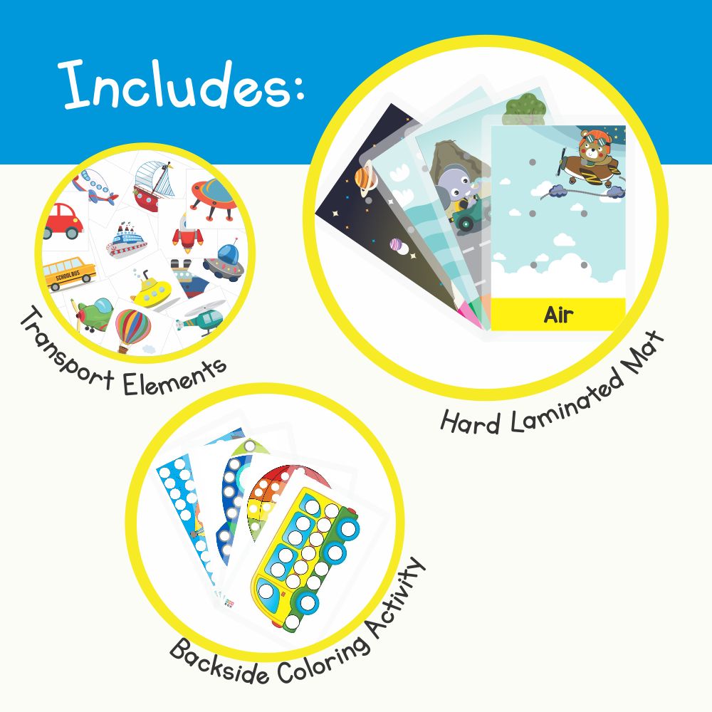 • 24 Vehicle Elements: A diverse collection of vehicles, including cars, planes, boats, and rockets, ready to be sorted onto the correct mats.