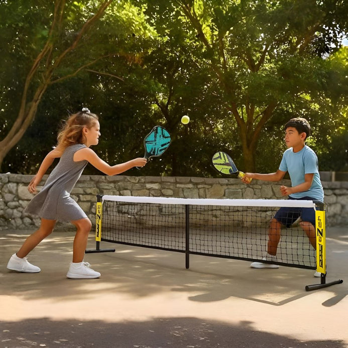 Introduce your kids to the exciting world of rubber balls with this comprehensive Youth Padel Net Set! This all-in-one kit includes a premium-quality net, two expertly crafted paddles, and two durable balls. The paddles feature 2 rackets with EVA handles (L40.5xW23xThickness 3.0 cm construction for durability and lightweight performance, with comfortable foam handles for proper grip and control. The sturdy net system is easy to set up and perfect for youth gameplay. This set is ideal for developing hand-eye coordination, agility, and social skills through active play, and is suitable for children aged 5 and above. The portable design enables quick setup and storage, making it convenient for both regular practice and occasional play sessions. Transform any space into a rubber ball court and have fun with family and friends!