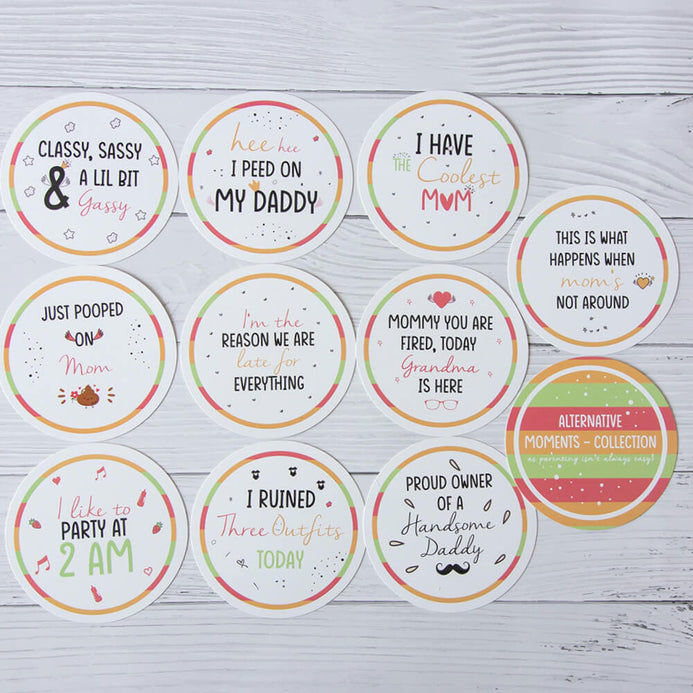 Documenting your baby’s fun- filled memories has never been easier- or more adorable! Our Alternative Moments Collection is a sassy & classy way for parents to capture such fun moments. They also make the perfect addition to your monthly milestone photos and compliment all of our designs. Finished with our signature white satin ribbon and eco-friendly packaging, they also make a lovely gift for baby showers or to place in gift baskets for a new mommy. A perfect keepsake to cherish for years to come. For memories to last, write your precious moments on the back side, with a permanent marker of course!