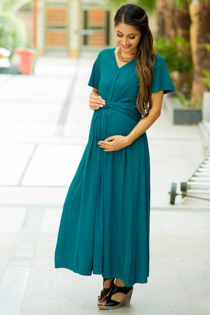 You can never go wrong with Momzjoy's emerald knot dress that can be worn for any occasion. This dress has a flexible fit during and after pregnancy and flatters the bump with gathers. Made in soft stretchable fabric, you can wear this dress in all seasons. This is perfect for maternity photoshoots.