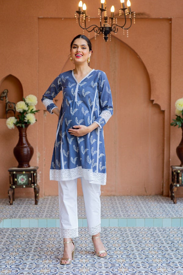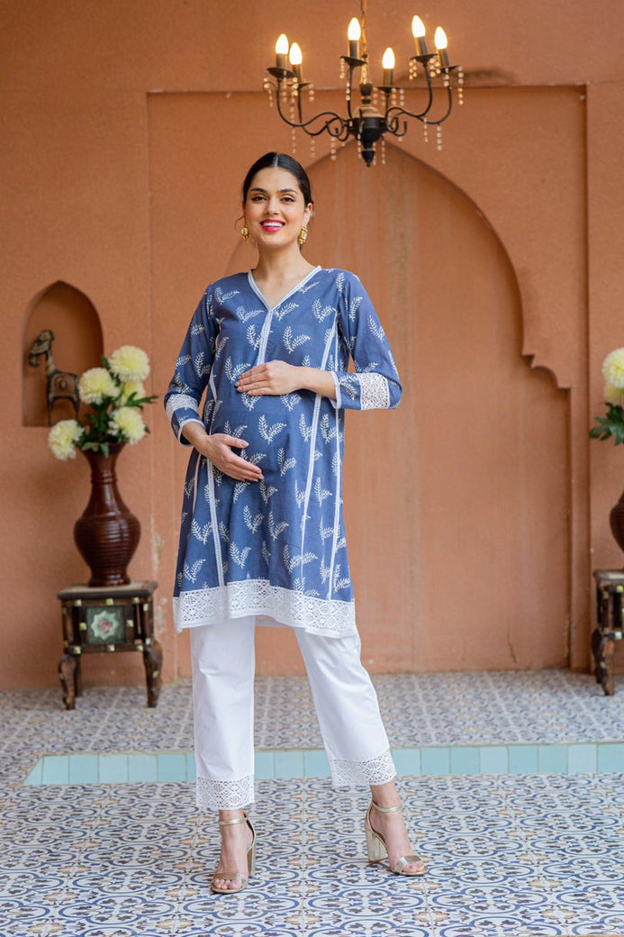 Look gorgeous in our maternity kurta set made in 100% cotton. It features plenty of gathers to provide space for easy movement. Classic and elegant this kurta and bottom is sure to turn heads.