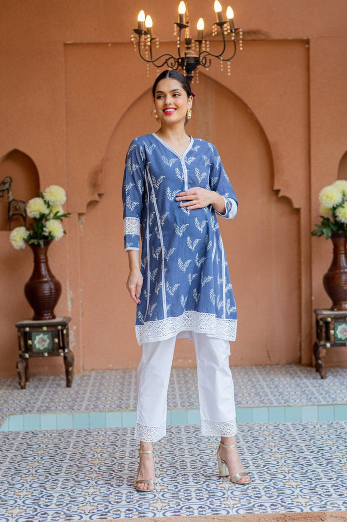 Luxe Cobalt Blue Cotton Maternity Kurta + Bump Band Bottom Coord Set