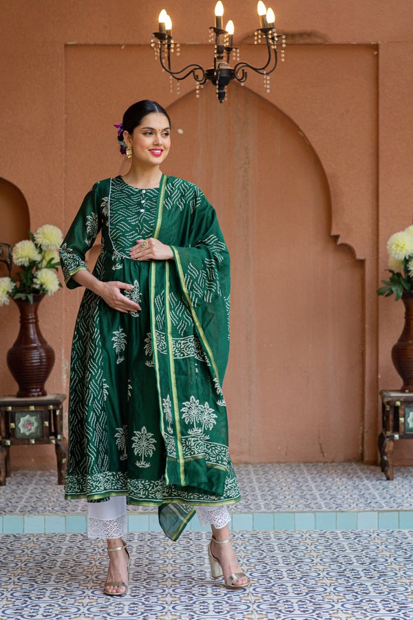 Premium Green Palm Chanderi Maternity Kurta + Bump Band Bottom + Dupatta