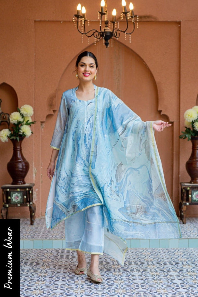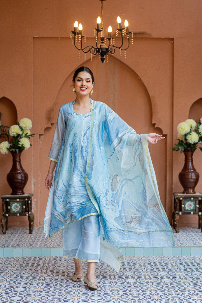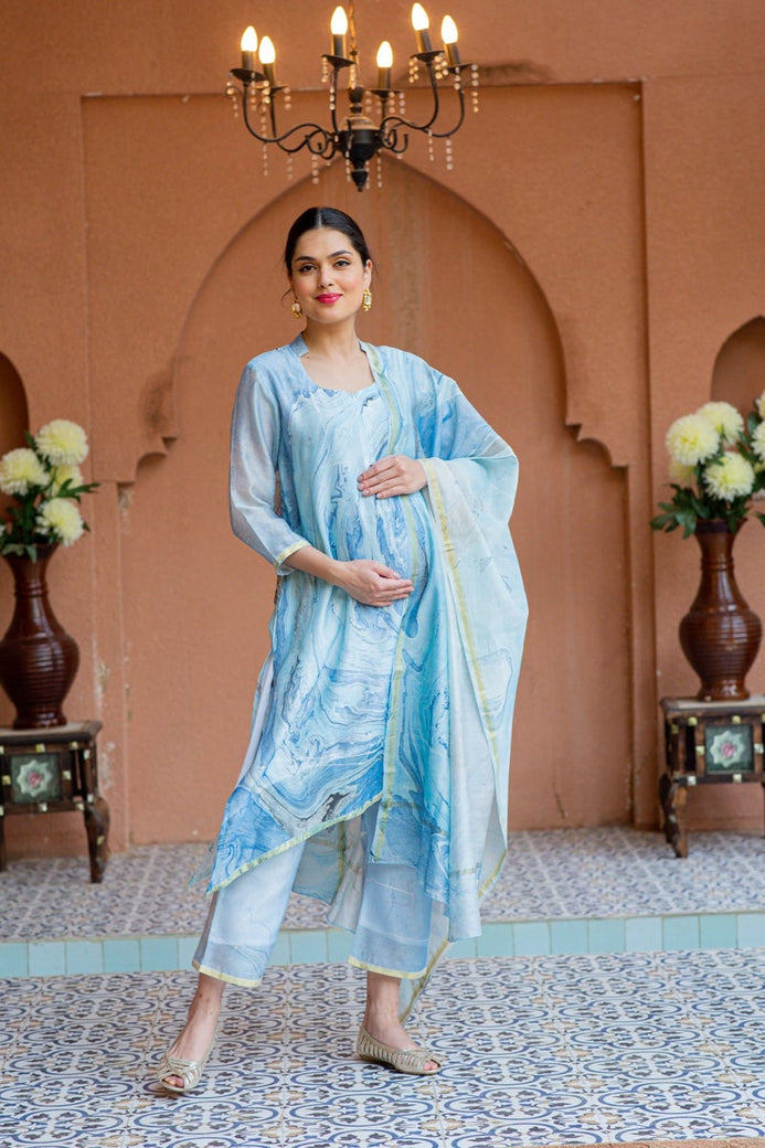 Look gorgeous in our set made in pure Chanderi silk. It features a unique cut that comforts your growing curves. This set is perfect for festivities and occasions.