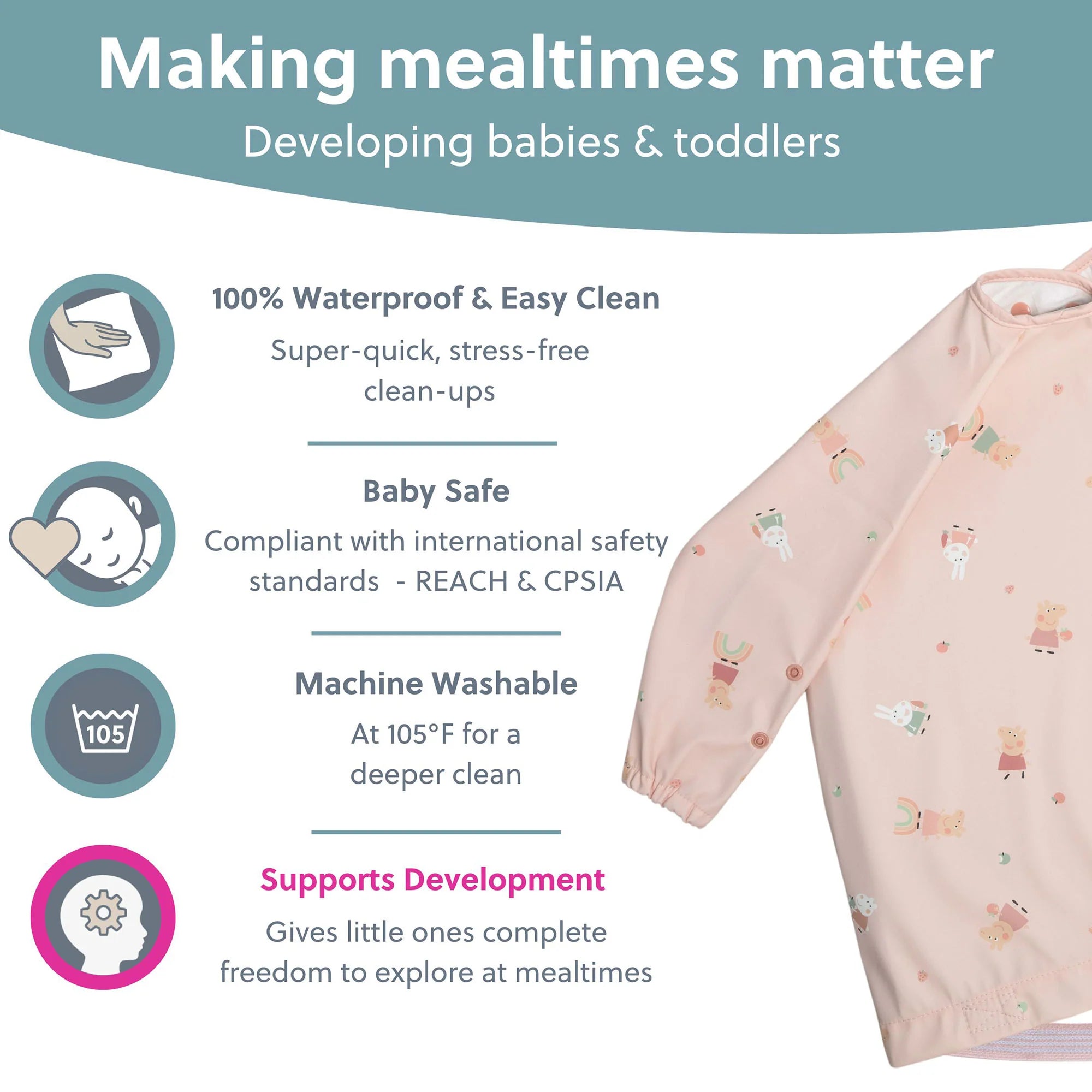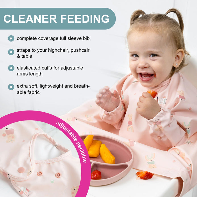 • Comfortable Design- Adjustable neck and sleeves provide a snug, comfortable fit, keeping little ones happy and content during mealtimes.