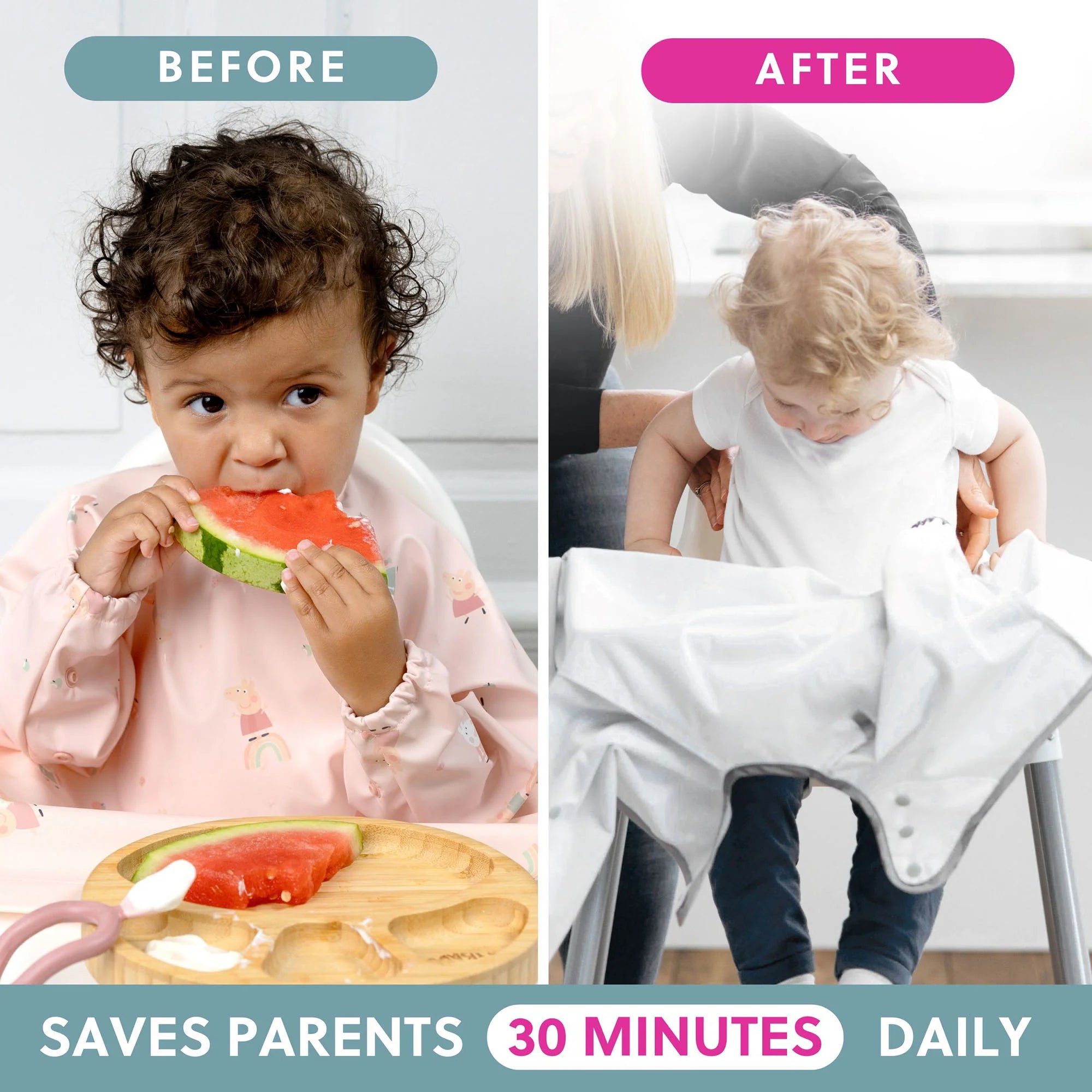 • Universal Fit - Adjustable patented straps attach to almost any high chair or pushchair, ensuring spill-catching coverage for clean and dry clothes during even the messiest meals.