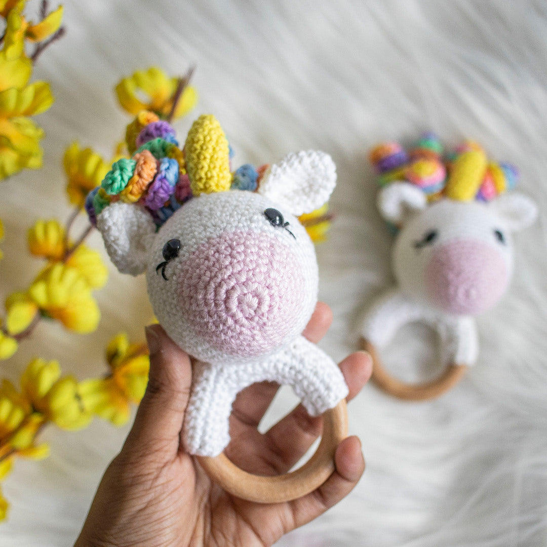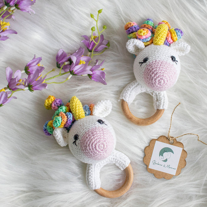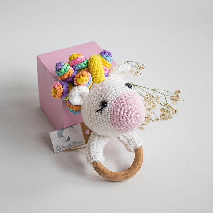 These handmade crochet rattles are soft and colourful with smooth handle of natural wood. Our wooden baby rattles are made of natural wood, environment friendly, safe and burr-free. These rattles help in developing fine motor skills, stimulating sensory development, hearing and tactile senses and generate attention.