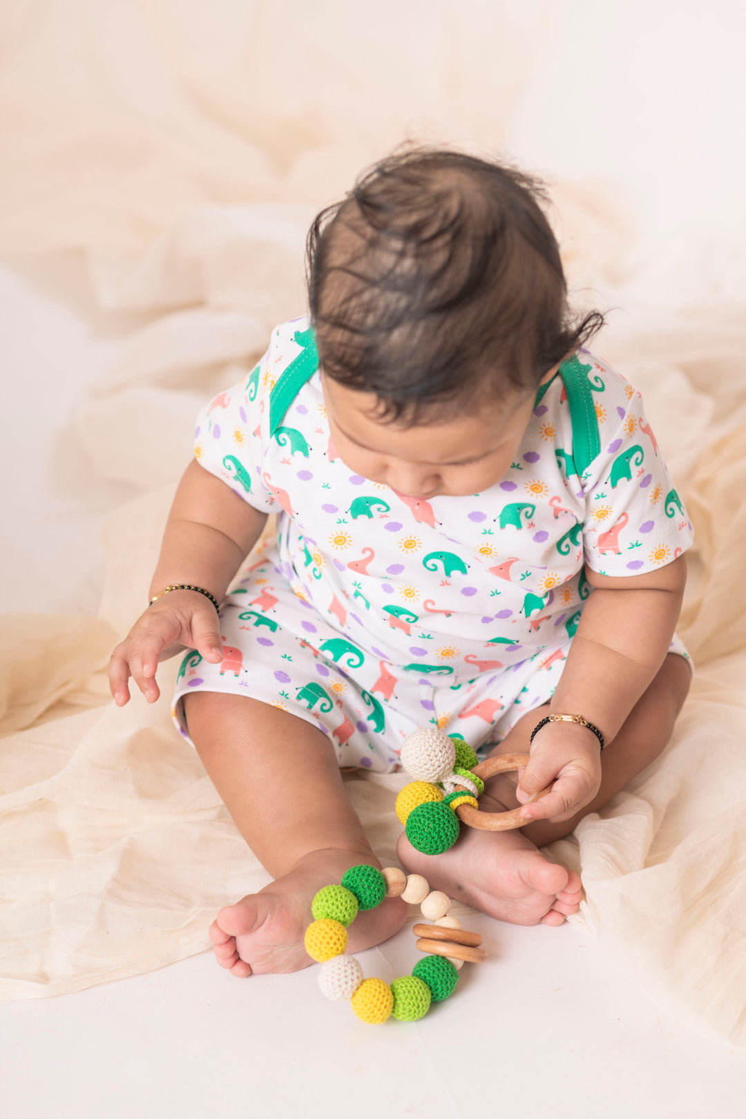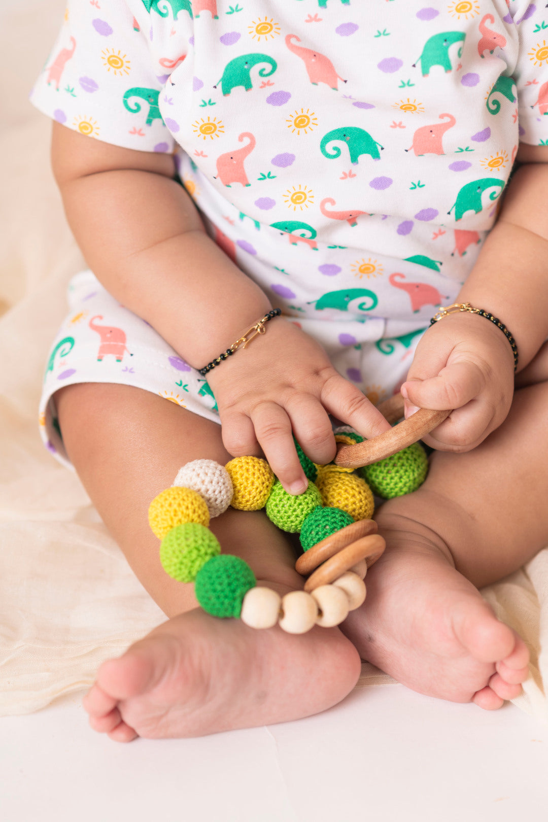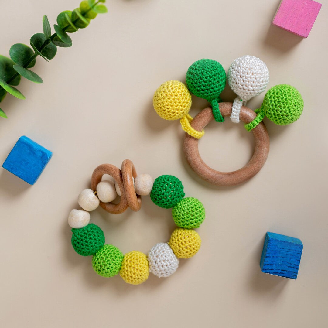WOODEN RATTLE AND TEETHER WITH CROCHET BEADS IS A CAPTIVATING TOY DESIGNED SPECIFICALLY TO STIMULATE YOUR CHILD AND ENSURE TO CAPTURE AND SLOWLY HELP THEM FOCUS THEIR ATTENTION TOWARDS THE SOUND. CRAFTED WITH UTMOST CARE AND ATTENTION TO DETAILS, THIS DELIGHTFUL TEETHER AND RATTLE OFFERS A PERFECT COMBINATION OF FUNCTIONALITY, SAFETY AND AESTHETIC APPEAL. THESE WOODEN RATTLE IS A GOOD GRASPING AID AND VERY SAFE FOR YOUR BABIES.