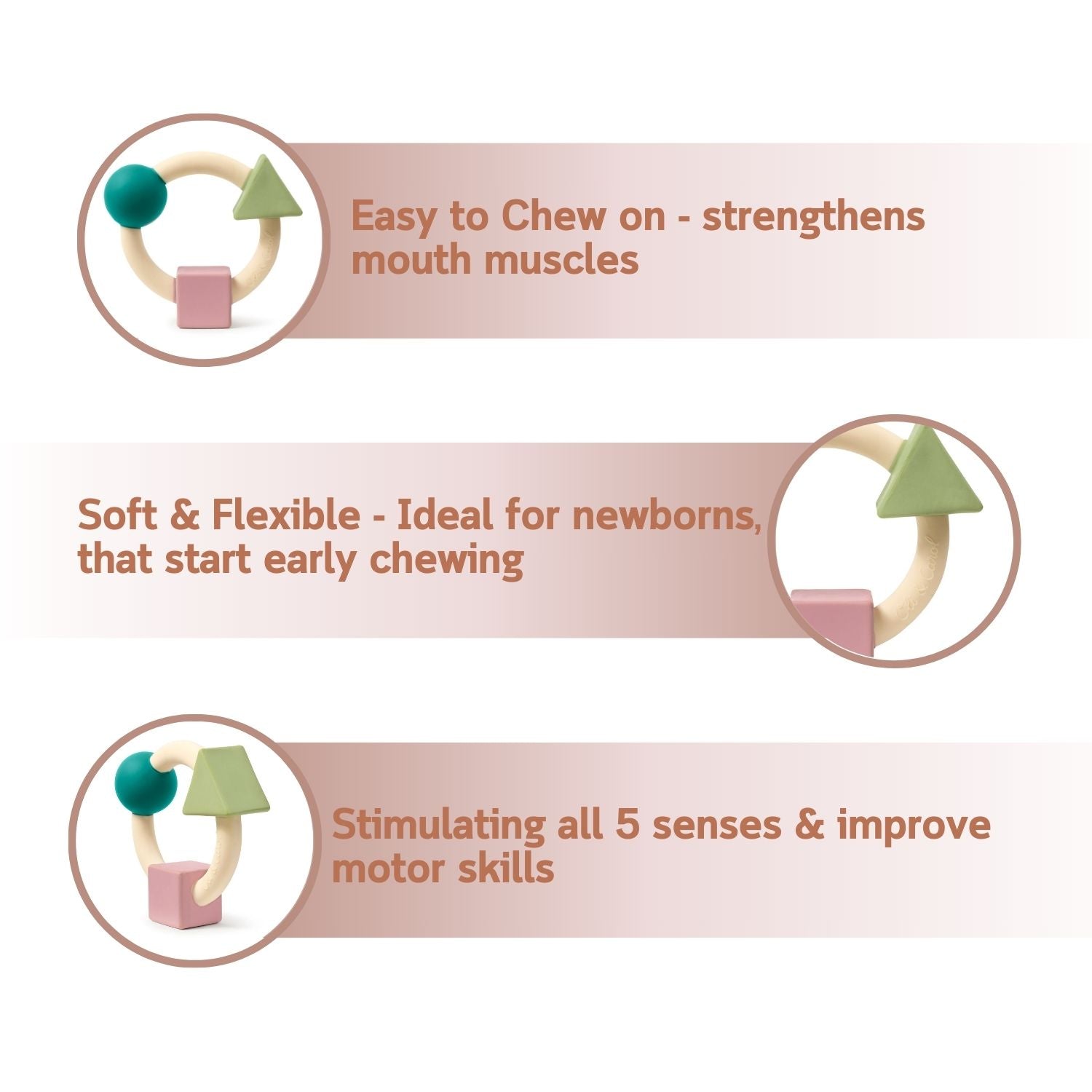 • Soft, easy to grasp and safe to chew. Stimulates baby's senses and soothes teething gums.