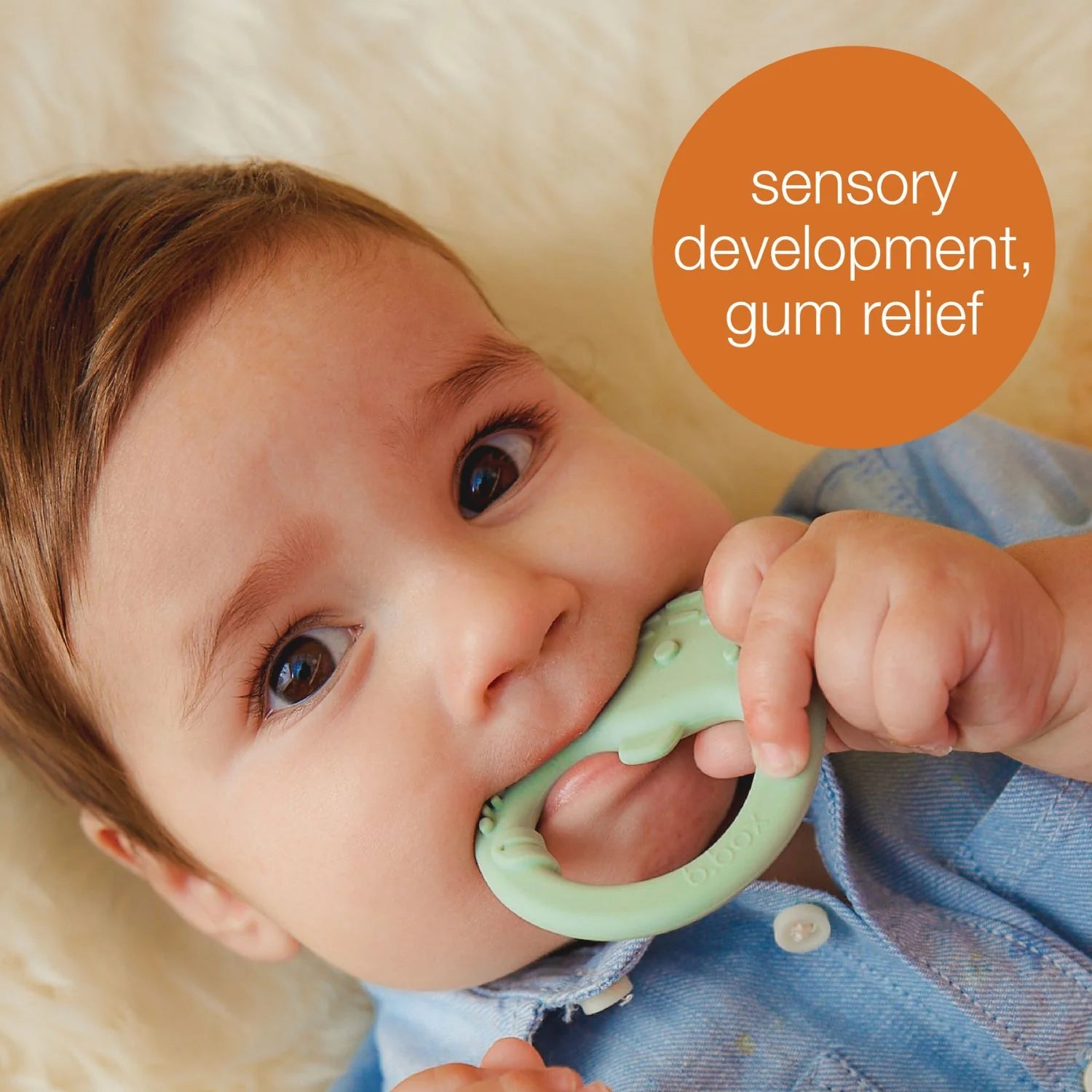 - Three teethers on one handy ring with varied textures gently massage sore and achy gums