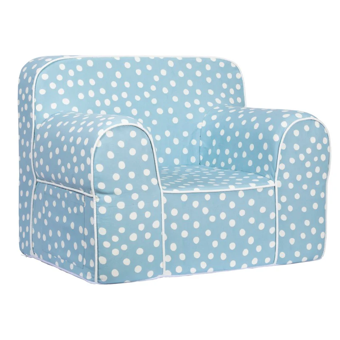 This amazing kids sofa has a frameless design that's incredibly comfy, so your little ones can lounge right alongside the family. The simple, all over dot print will match all kinds of decor, and the chair can even be personalized with a name. Carry it from room to room with the helpful handle at the back, and use the pocket on the sides to hold favorite books and toys. The machine washable, 100% cotton canvas cover allows you handle clean up quickly and easily. Choose the dot print on brown, powder, blue, pale yellow or pale green colors to match your dïr.
