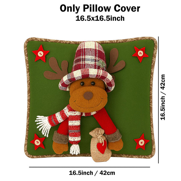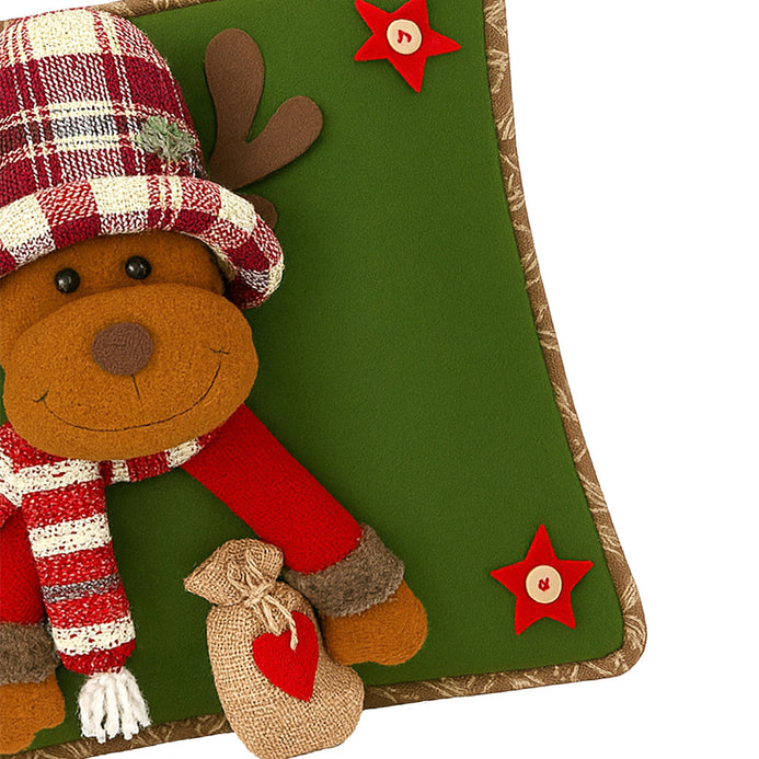 2. Unique Designed Pillow Cover: This pillow cover features a cute 3D rudolf with a plaid hat, soft antlers, a scarf, and stitched heart buttons on a green background. The detailed work makes it a standout piece for Christmas Decor.