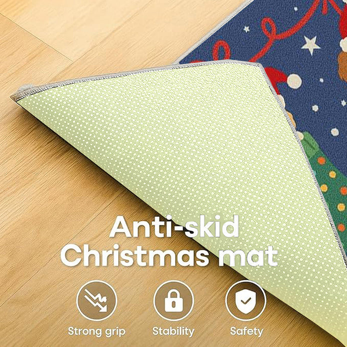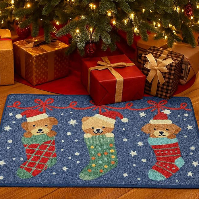 2. Christmas Artwork: The mat showcases detailed artwork of puppies in patterned stockings, each wearing a Santa hat, set against a snowy and a star-filled blue backdrop, creating a sweet and playful festive scene.