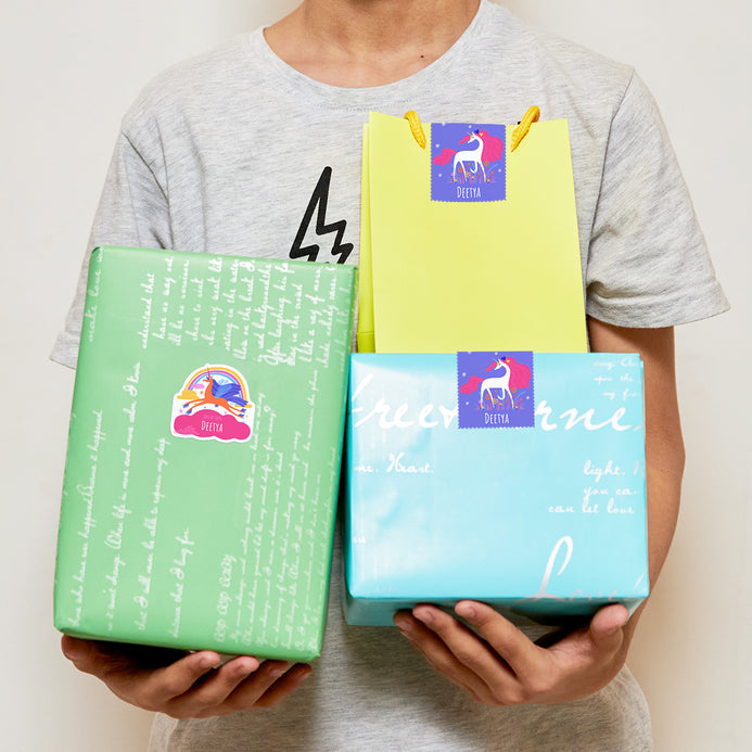 Elevate your gifting game with personalized water-resistant Name Stickers. You can easily use them to seal gift bags & boxes and also to add your kids name to their birthday return favours & more! These stickers also work great for all your easy-to-lose school supplies like pencils, rulers, small toys etc.