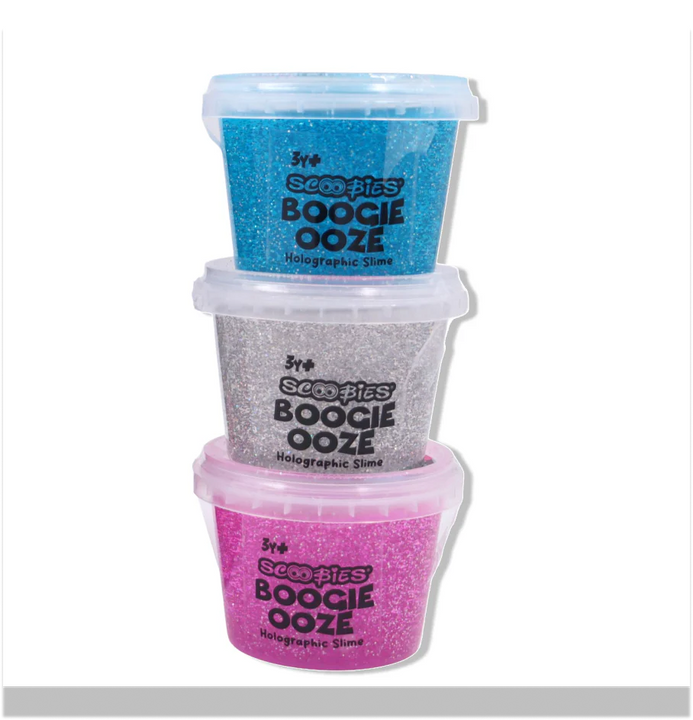 This trio of dazzling, iridescent slimes — Pink Holographic, Blue Holographic, and Pure Holographic — is packed with shimmering glitter and a mesmerizing color-shift effect. Smooth, stretchy, and oh-so-satisfying, Boogie Ooze is designed for sensory fun, stress relief, and creative play.