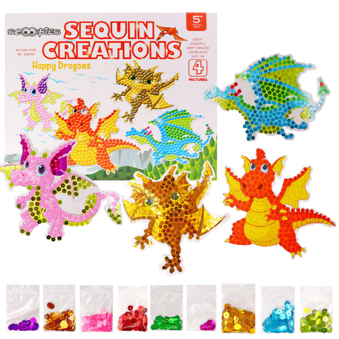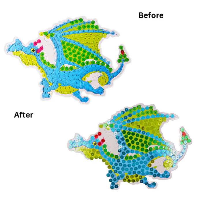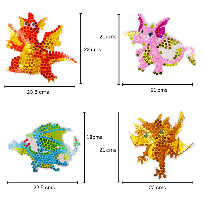 Pack Includes: .4 pre-printed dragon cards, 965 multicolored assorted sequins and an instruction leaflet. Sequins comes in transparent easy-to-use store zip pouch.
