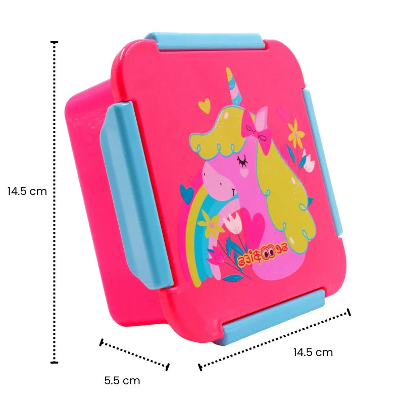 • Design - This lunchbox is made in a combination of pink & blue colors, this Unicorn comes with a vibrant spiraling honk, and bow surrounded by rainbow & flowers all around.