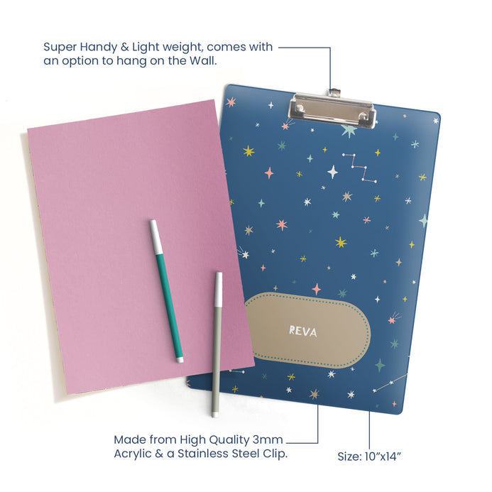 You may not realise it, but a clipboard is an irreplaceable part of school and is useful during exams, classes, drawing and other activities. So how amazing would it be to give your kid a custom clipboard of their favourite colour with personalised printed names and designs! They can carry this easy-to-store and premium quality online clipboard to school with pride. Made from high-quality 3mm acrylic, it is lightweight, comes with a stainless steel clip and can be hung on the wall. Personalize a themed clipboard with your child’s name, initials or any other text. Kids will enjoy carrying it around school/classes for homework & more. Customize this kid’s clipboard with a name for the perfect gift for birthday parties, back-to-school supplies & more.