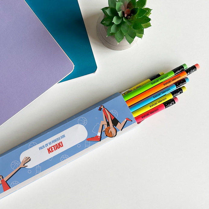 Upgrade your stationery collection with Personalized Pencils in a Custom Pencil Box, featuring high-quality Doms Neon Rubber-Tipped HB/2 Graphite Pencils designed for smooth, stress-free writing with an ergonomic grip and extra-dark lead for precision. Customize the pencil box with stylish designs and add any name or text to the pencils for a unique touch, making this set perfect for kids, teachers, professionals, and anyone looking to organize their stationery in style. Ideal for school, office, or gifting, these personalized pencils are a thoughtful addition to kids' birthday return gift hampers, promotional events, or as a stylish and practical gift for any occasion. Note: Pencil box customization excludes the sharper and eraser sleeve.
