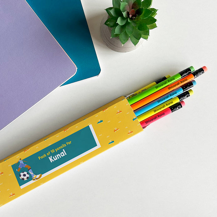 Upgrade your stationery collection with Personalized Pencils in a Custom Pencil Box, featuring high-quality Doms Neon Rubber-Tipped HB/2 Graphite Pencils designed for smooth, stress-free writing with an ergonomic grip and extra-dark lead for precision. Customize the pencil box with stylish designs and add any name or text to the pencils for a unique touch, making this set perfect for kids, teachers, professionals, and anyone looking to organize their stationery in style. Ideal for school, office, or gifting, these personalized pencils are a thoughtful addition to kids' birthday return gift hampers, promotional events, or as a stylish and practical gift for any occasion. Note: Pencil box customization excludes the sharper and eraser sleeve.