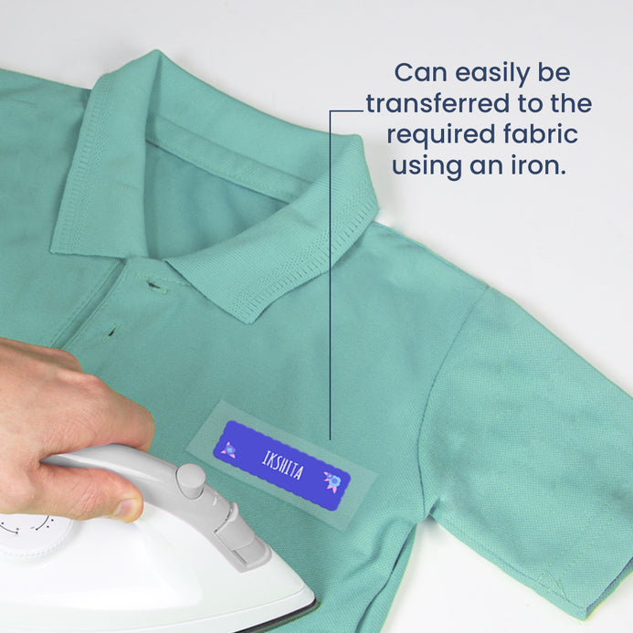 Tired of lost or mixed-up clothes? These Iron-On Name Labels are the perfect solution for school-going kids, siblings, and boarding school students. These durable, washable, and easy-to-apply labels ensure that your child’s clothing stays identified and never gets misplaced. Simply place the label on the cloth and iron above it for about 1 minute - it's that easy! No more searching through lost-and-found piles, as these labels stay put through multiple washes and won’t fade or peel off. Personalized with your child’s name (up to 12 characters), each set includes 26 labels and comes in 24 fun designs like sports, unicorn, floral, dino, and more. NOTE: Iron on labels are very easy to apply with a home iron. Exact instructions will be enclosed in the package ordered.