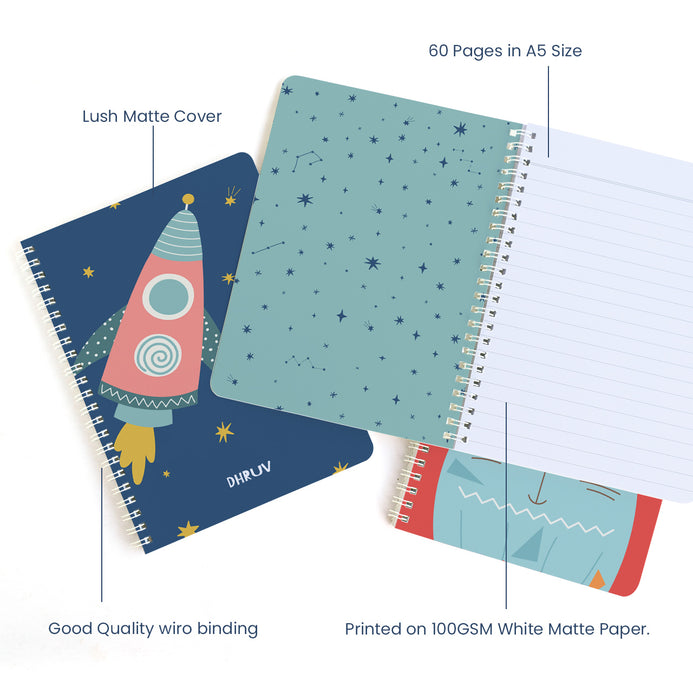 How excited will your kids be if their notebook had their favourite theme & their name on the cover page? Pick from dotted, ruled or plain pages & enjoy this customized Spiral bound Notebook! Let them indulge in creative writing, journaling, doodling, making study timetables & more. Our range of customized Spiral Notebooks are a big yes for kids of all ages! This spiral binding notebook has pretty and customised designs on the front that you can change. It has 60 pages and is printed on white matte paper with premium quality for the best writing experience.