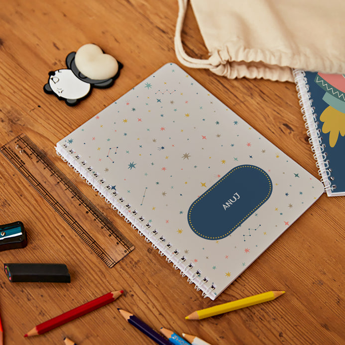 How excited will your kids be if their notebook had their favourite theme & their name on the cover page? Pick from dotted, ruled or plain pages & enjoy this customized Spiral bound Notebook! Let them indulge in creative writing, journaling, doodling, making study timetables & more. Our range of customized Spiral Notebooks are a big yes for kids of all ages! This spiral binding notebook has pretty and customised designs on the front that you can change. It has 60 pages and is printed on white matte paper with premium quality for the best writing experience.