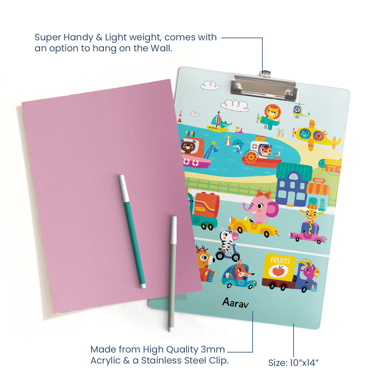 You may not realise it, but a clipboard is an irreplaceable part of school and is useful during exams, classes, drawing and other activities. So how amazing would it be to give your kid a custom clipboard of their favourite colour with personalised printed names and designs! They can carry this easy-to-store and premium quality online clipboard to school with pride. Made from high-quality 3mm acrylic, it is lightweight, comes with a stainless steel clip and can be hung on the wall. Personalize a themed clipboard with your child’s name, initials or any other text. Kids will enjoy carrying it around school/classes for homework & more. Customize this kid’s clipboard with a name for the perfect gift for birthday parties, back-to-school supplies & more.