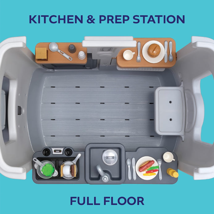- In the box: Camper base with grill space, kitchenette with large storage bin, and accessory set including play food and utensils.