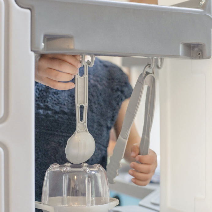• Realistic Play Kitchen: Features faux stainless steel, lifelike wooden accents & neutral color palette