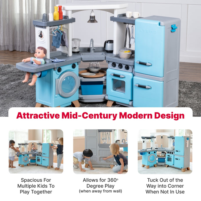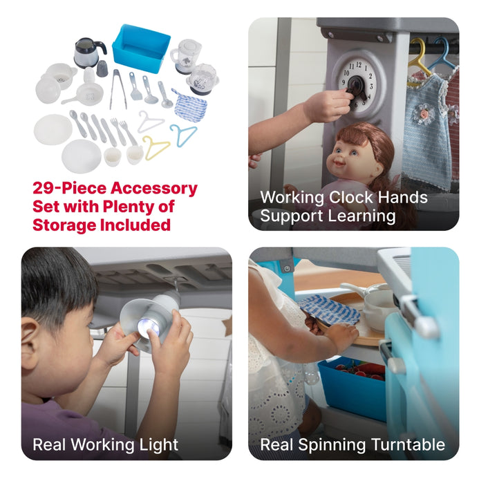 Step into a pretend world full of fun and beautiful design elements with the Cook & Care Corner Kitchen & Nursery™ play kitchen. With plenty of interactive features kids will stay engaged and entertained for hours as they mimic their adult role models by cooking cleaning and caring for their baby doll. Little ones can keep pretend kitchen ingredients fresh in the vintage-style fridge or freezer and store gadgets in extra-large bins. Your child can pretend to fire up the stove illuminate the sink with the push-to-activate hanging light and fry boil blend or pop on the pretend burner with electronic lights and sounds that activate automatically when an item is placed on the surface. Little helpers can load the toy washing machine and hang up clothes to dry while baby doll (not included) relaxes in the built-in highchair. Made in the USA