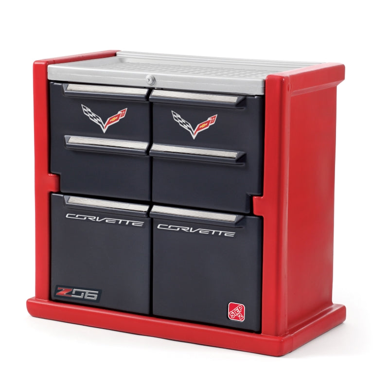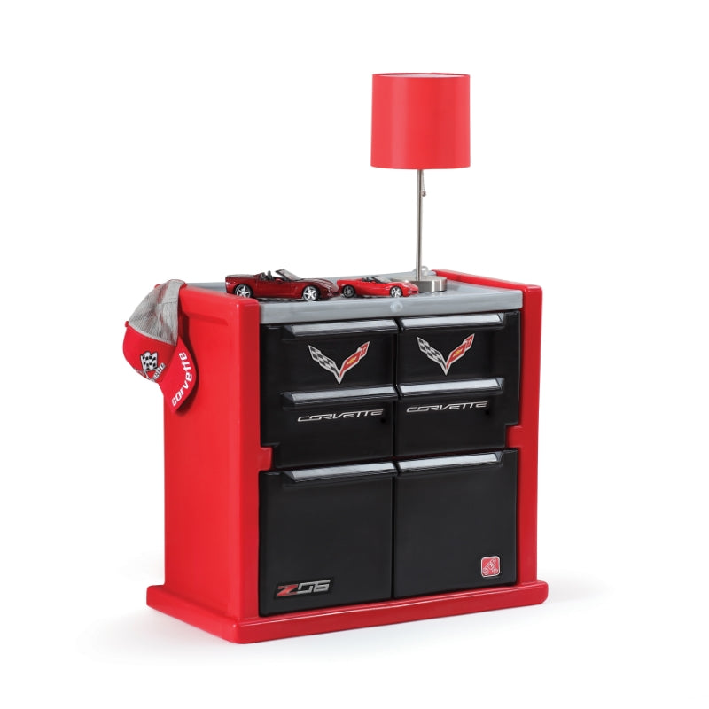 Little racers will love getting organized with this Step2 Dresser! It is the perfect addition to a Corvette® themed playroom or bedroom. This storage dresser will teach your child how to put away their toys, clothes and books. This storage dresser makes organization fun for children while teaching responsibility. Made in the USA of US and imported parts.