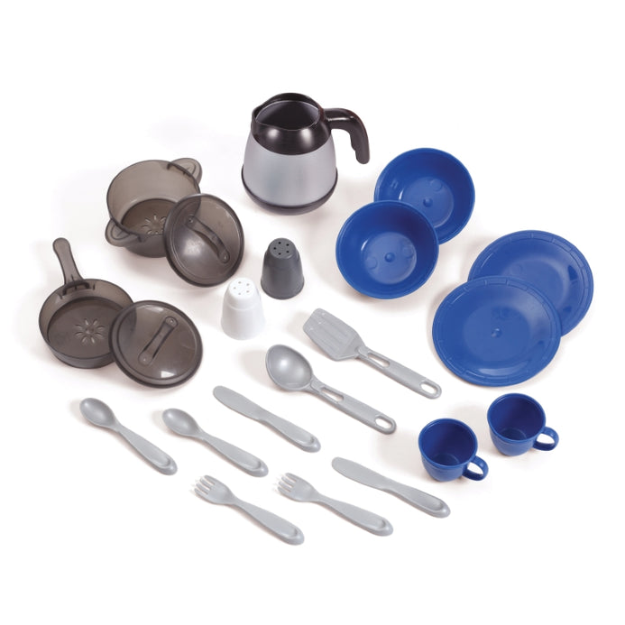 - In the box: Kitchen playset, 21-piece accessory set with pots and pans, silverware, coffee pot, and more.