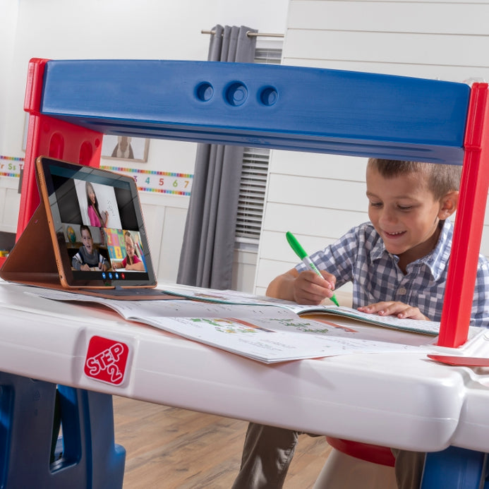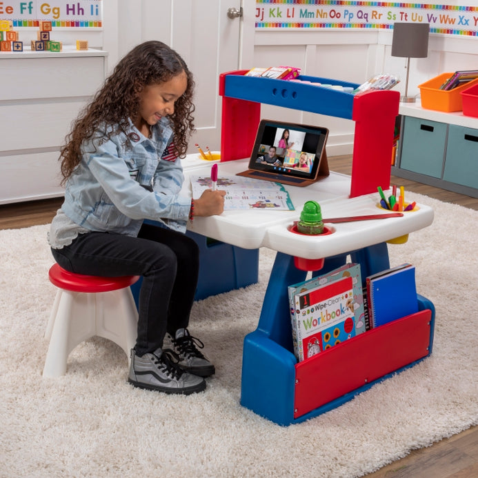 - Sturdy, colorful shelf provides additional storage and can be re-positioned to turn personal desk into a table accommodating two children