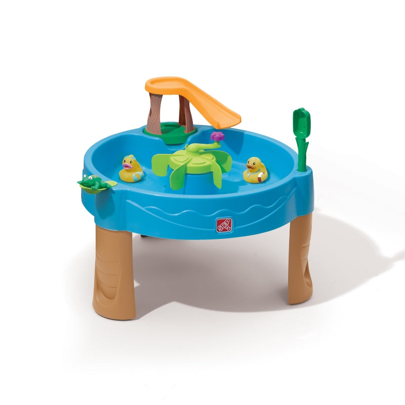 Quack, quack! It’s time to splash around with the Step2 Duck Pond Water Table™! Water table play not only fascinates little imaginations but also encourages sensory skills as kids squeeze the rubber duck and frog toys while splashing around in the water. Little ones can also take turns using the side flipper to see who can get the highest jump at their very own outdoor water activity center. Who can get the largest splash? Send the included duck and frog toys down the water slide, and make a big wave in the basin with the whirlpool spinner. Toddlers and preschoolers will have a blast with this pond-themed water table! The large water table design and included accessories make it easy to engage in fun social play with friends, and practicing sharing skills too! Made in USA.