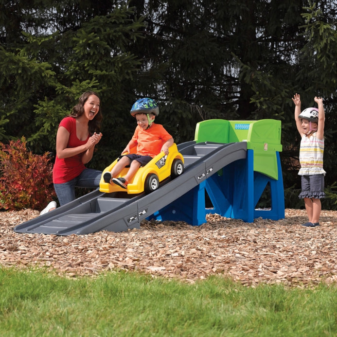 Turn your backyard into a mini amusement park with this Step2 Toy Roller Coaster. This huge colorful kid’s roller coaster toy is designed for preschoolers but still a hit with older children. Climbing the stairs to reset the ride helps to foster balance and develop gross motor skills while giving kids plenty of exercise during outdoor play. Durable enough to be left outside year round, this toy roller coaster will be an instant backyard hit. Made in USA of US and imported parts.