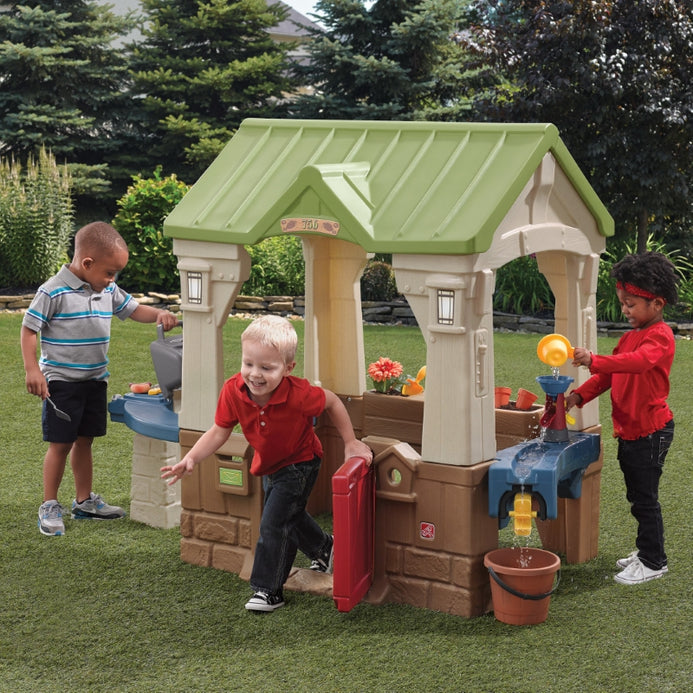 This Step2 playhouse for toddlers encourages hours of imaginative backyard play fun with friends! This outdoor playhouse includes a pass-through mail slot, working water pump with water-activated spinner, bucket and planting station with two flower pots that can be used to grow real flowers. Keep an eye on your little ones as they play with the open-concept design. Little ones can get creative with pretend play in the playhouse that is large enough for multiple toddlers to play together at once. They’ll love entertaining friends and family with their very own toy grill station with clickable knobs and working lid, too! Join the fun and gather around the grill for a cookout, and use the working Dutch-style door to welcome friends inside. This kids’ outdoor playhouse features molded-in detailing that mimics a real house, like the number plate with decal, bird house, realistic stacked stone, and light posts! Plus, the neutral color palette makes this playhouse a seamless addition to any backyard play space. Made in the USA of US and imported parts.