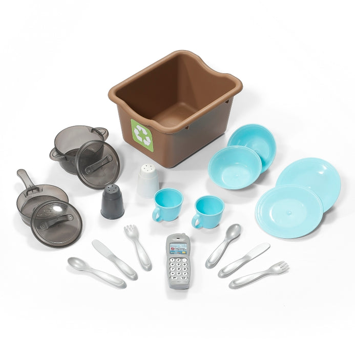 - In the box: Kitchen playset, 20-piece accessory set including cookware, dishes, and recycle bin.