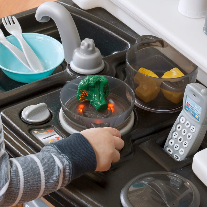 There’s no end to imaginary play with the Step2 Lifestyle Custom Kitchen™, where little chefs can play the day away with realistic kitchen amenities and other exciting features! Reach into the convenient refrigerator for fresh ingredients, and use the pretend water station for a refreshing drink. Activate the stovetop’s electronic lights and sounds with the special cookware to make bubbling and sizzling noises as each dish is prepared! The large countertop space has plenty of room to accommodate multiple kids as they prep meals together, and they can use the microwave with realistic keypad feature to “reheat” leftovers and the molded-in sink for clean-up at the end of each mealtime. A bonus for kids and parents alike, this pretend kitchen playset also incudes lots of storage space, from the dish rack to pull-out cabinet and recycling bin. Made in USA of US and imported parts.