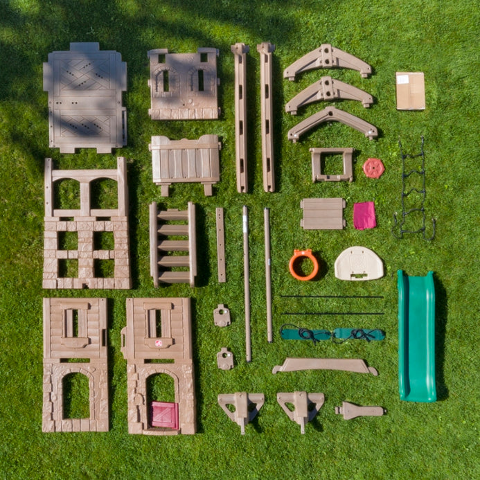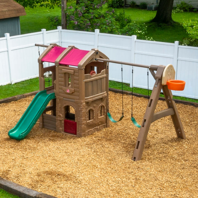 Complete with a two-story clubhouse, this kids’ swing set has so many cool features to keep them entertained – and outside – with active play for hours! The Naturally Playful Adventure Lodge Play Center is a great way to get multiple kids outside socializing and playing together, from the swings and clubhouse hiding spot with working door to the backboard hoop for a quick ball toss game (sorry, ball not included) and more! Kids will enjoy climbing the rope ladder for a bird’s eye view of the backyard, as well as the sturdy steps into the clubhouse to take the slide back down. Their imaginations will run wild with this backyard swing set and clubhouse for kids, where pretend play awaits. Pretend the rustic lodge clubhouse is a pirate ship and use the steering wheel to escape enemy ships; fly through the sky with a make-believe airplane; and even cruise through the desert with a dune buggy – the pretend play possibilities are endless! Plus, this swing set is sturdy and durable; made to last through the most active play for years with double-wall construction that’s fade resistant, never chips or needs to be stained, and is easy to clean. Secure the ground anchors to ensure this outdoor playset stays strong and in place for kids to enjoy for years to come! Made in USA of US and imported parts.