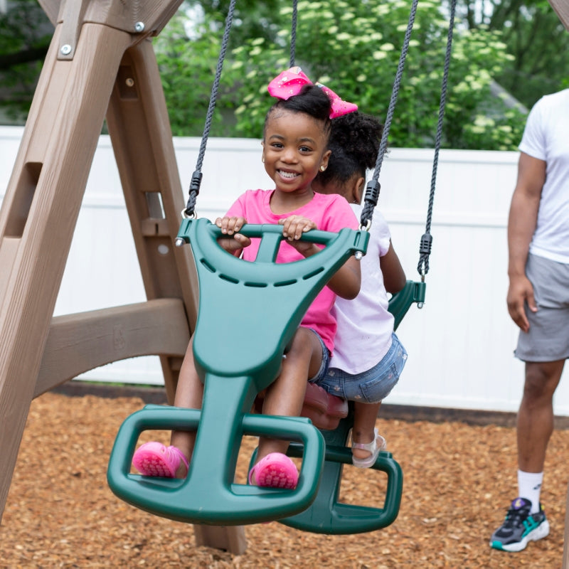 Complete with a two-story clubhouse, this kids’ swing set has so many cool features to keep them entertained – and outside – with active play for hours! The Naturally Playful Adventure Lodge Play Center with Glider is a great way to get multiple kids outside socializing and playing together, from the swings and clubhouse hiding spot with working door to the backboard hoop for a quick ball toss game (sorry, ball not included), two-seated glider, and more! Kids will enjoy climbing the rope ladder for a bird’s eye view of the backyard, as well as the sturdy steps into the clubhouse to take the slide back down. Their imaginations will run wild with this backyard swing set and clubhouse for kids, where pretend play awaits. Pretend the rustic lodge clubhouse is a pirate ship and use the steering wheel to escape enemy ships; fly through the sky with a make-believe airplane; and even cruise through the desert with a dune buggy – the pretend play possibilities are endless! Plus, this swing set is sturdy and durable; made to last through the most active play for years with double-wall construction that’s fade resistant, never chips or needs to be stained, and is easy to clean. Secure the ground anchors to ensure this outdoor playset stays strong and in place for kids to enjoy for years to come! Made in the USA of US and imported parts.