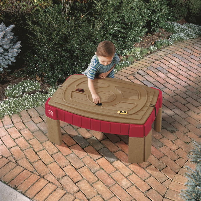 - Outdoor sandbox table keeps sand at a convenient level for toddlers to play.